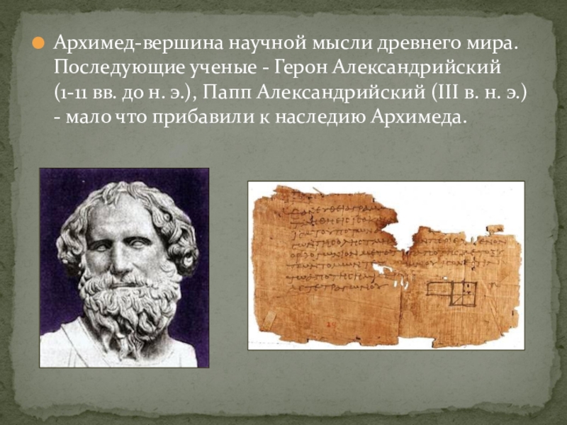 Слайд 2Архимед-вершина научной мысли древнего мира. Последующие ученые - Герон Александрийский (1-11
