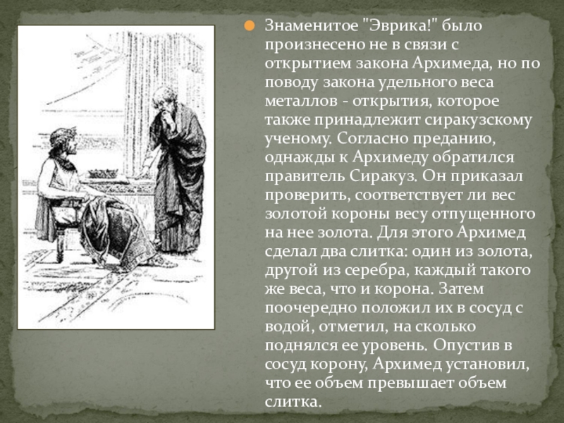 Слайд 7Знаменитое "Эврика!" было произнесено не в связи с открытием закона Архимеда,