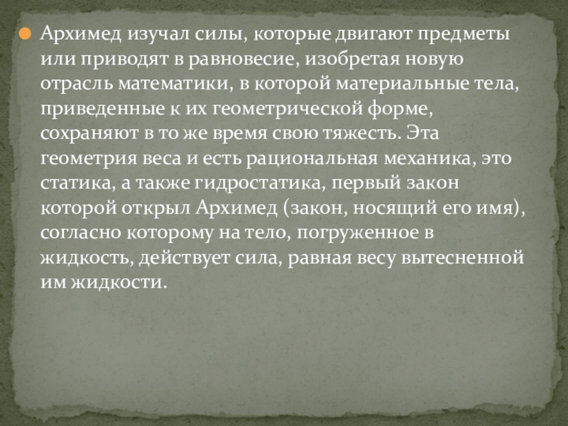 новую отрасль математики, в которой материальные тела, приведенные к их геометрической форме, сохраняют в то же время свою тяжесть. Эта геометрия веса и есть рациональная механика, это статика, а также гидростатика, первый закон которой открыл Архимед (закон, носящий его имя), согласно которому на тело, погруженное в жидкость, действует сила, равная весу вытесненной им жидкости.