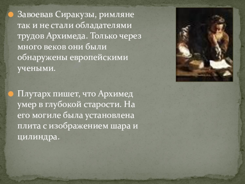 Слайд 10Завоевав Сиракузы, римляне так и не стали обладателями трудов Архимеда. Только