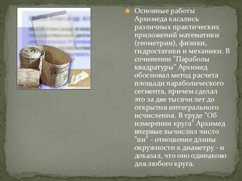 Слайд 4Основные работы Архимеда касались различных практических приложений математики (геометрии), физики, гидростатики