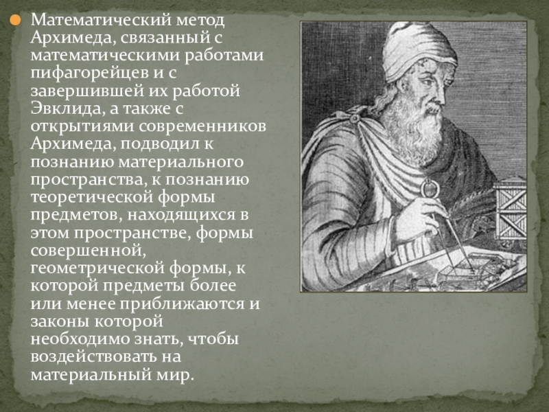 Слайд 5Математический метод Архимеда, связанный с математическими работами пифагорейцев и с завершившей