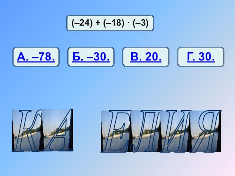 (–24) + (–18) · (–3)А. –78.Б. –30.В. 20.Г. 30.К А Е Л И Я