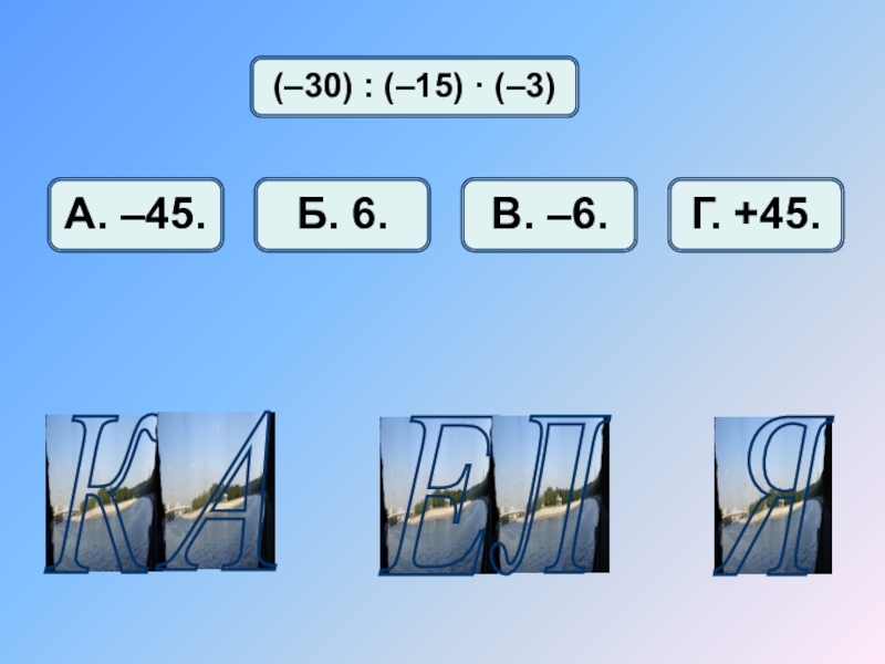 (–30) : (–15) · (–3)А. –45.Б. 6.В. –6.Г. +45.К А Е Л Я