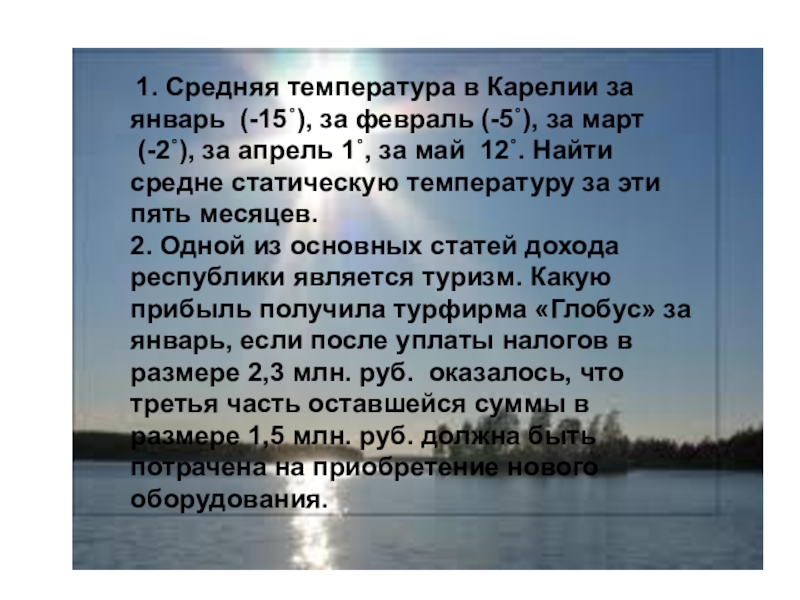 1. Средняя температура в Карелии за январь (-15˚), за февраль (-5˚), за март (-2˚), за апрель