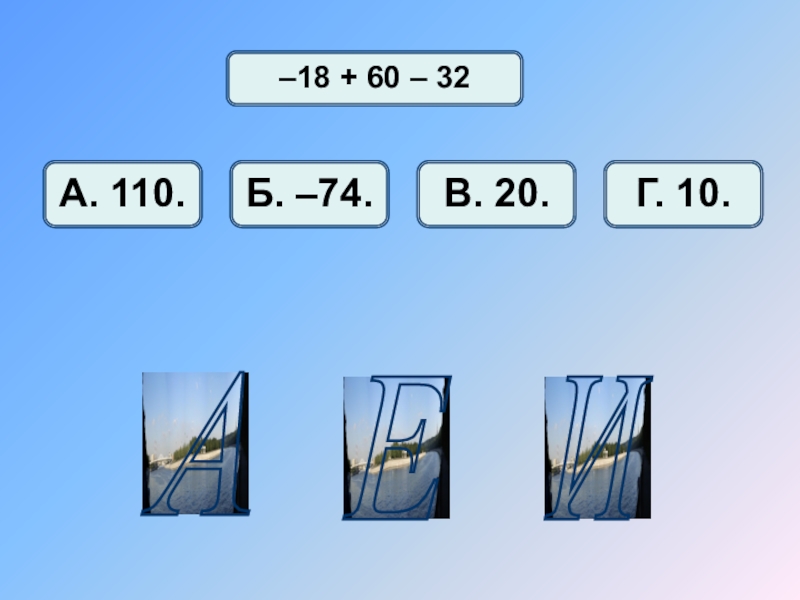 –18 + 60 – 32А. 110.Б. –74.В. 20.Г. 10.А Е И