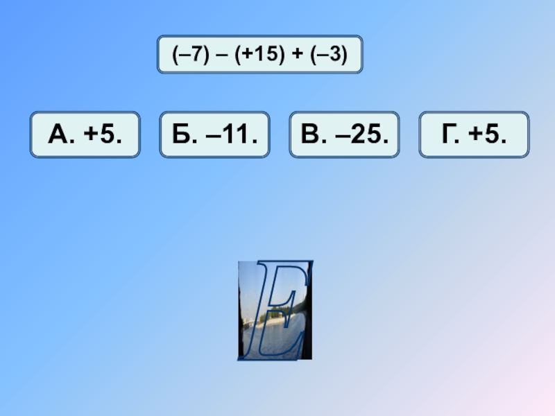 (–7) – (+15) + (–3)А. +5.Б. –11.В. –25.Г. +5.Е