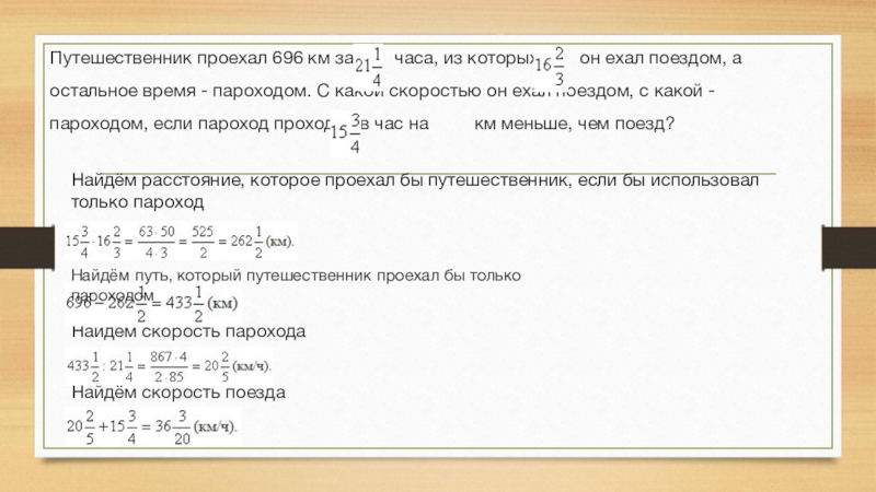 Путешественник проехал 696 км за часа, из которых он ехал поездом, а остальное время - пароходом. С какой скоростью он ехал поездом, с какой - пароходом, если пароход проходил в час на км меньше, чем поезд?