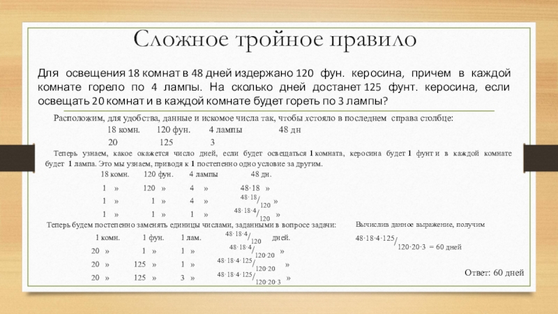 Теперь узнаем, какое окажется число дней, если будет освещаться 1 комната, керосина будет 1 фунт и в каждой комнате будет 1 лампа. Это мы узнаем, приводя к 1 постепенно одно условие за другим.