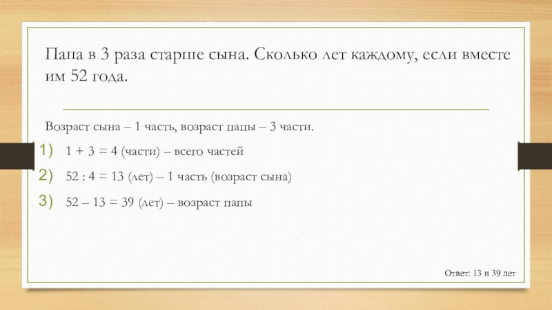 52 : 4 = 13 (лет) – 1 часть (возраст сына)