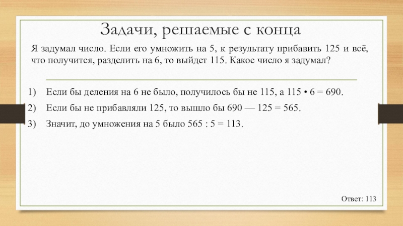Значит, до умножения на 5 было 565 : 5 = 113.