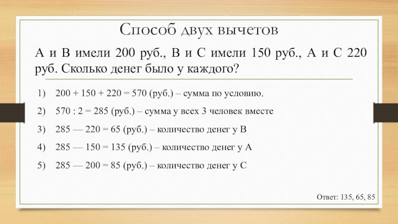 285 — 150 = 135 (руб.) – количество денег у А