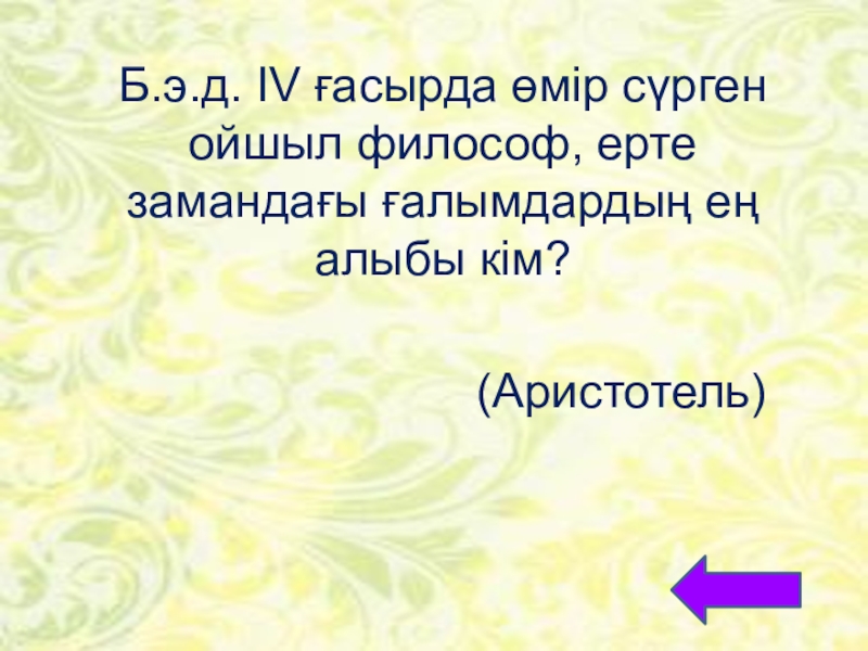 Слайд 14Б.э.д. IV ғасырда өмір сүрген ойшыл философ, ерте замандағы ғалымдардың ең