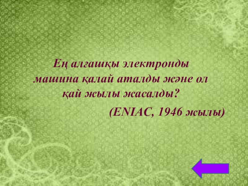 Слайд 9Ең алғашқы электронды машина қалай аталды және ол қай жылы жасалды?
