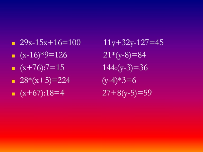 Слайд 729х-15х+16=100 11у+32у-127=45