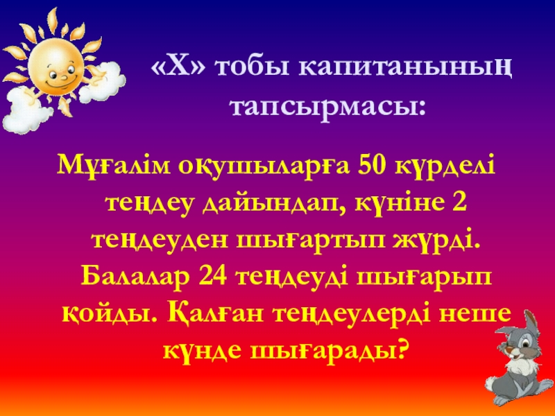 2 теңдеуден шығартып жүрді. Балалар 24 теңдеуді шығарып қойды. Қалған теңдеулерді неше күнде шығарады?