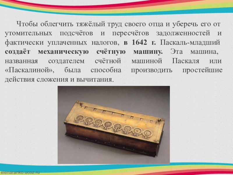 подсчётов и пересчётов задолженностей и фактически уплаченных налогов, в 1642 г. Паскаль-младший создаёт механическую счётную машину. Эта машина, названная создателем счётной машиной Паскаля или «Паскалиной», была способна производить простейшие действия сложения и вычитания.