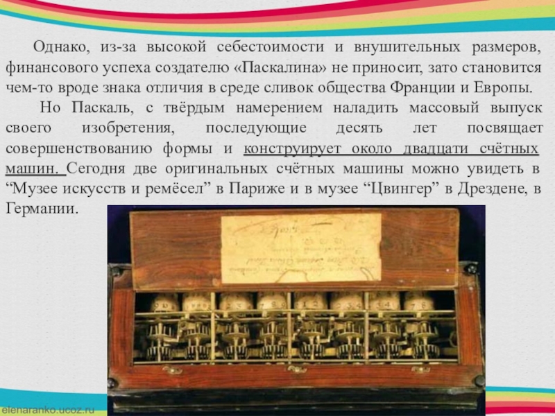 Слайд 9Однако, из-за высокой себестоимости и внушительных размеров, финансового успеха создателю «Паскалина»