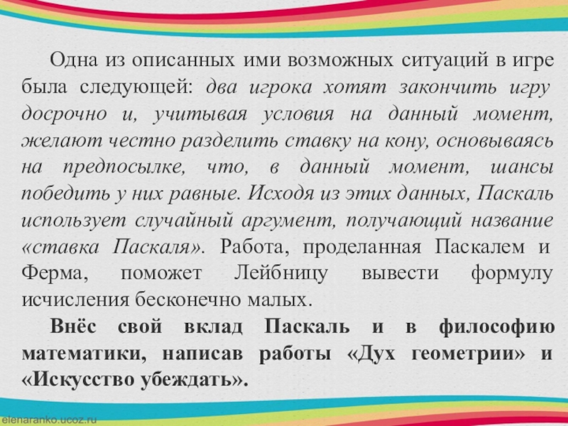 игрока хотят закончить игру досрочно и, учитывая условия на данный момент, желают честно разделить ставку на кону, основываясь на предпосылке, что, в данный момент, шансы победить у них равные. Исходя из этих данных, Паскаль использует случайный аргумент, получающий название «ставка Паскаля». Работа, проделанная Паскалем и Ферма, поможет Лейбницу вывести формулу исчисления бесконечно малых.