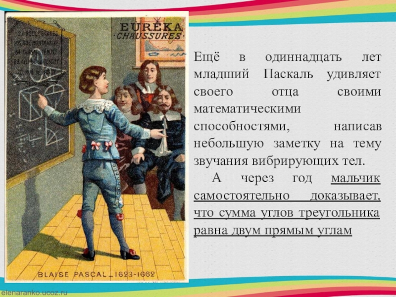 Слайд 4Ещё в одиннадцать лет младший Паскаль удивляет своего отца своими математическими