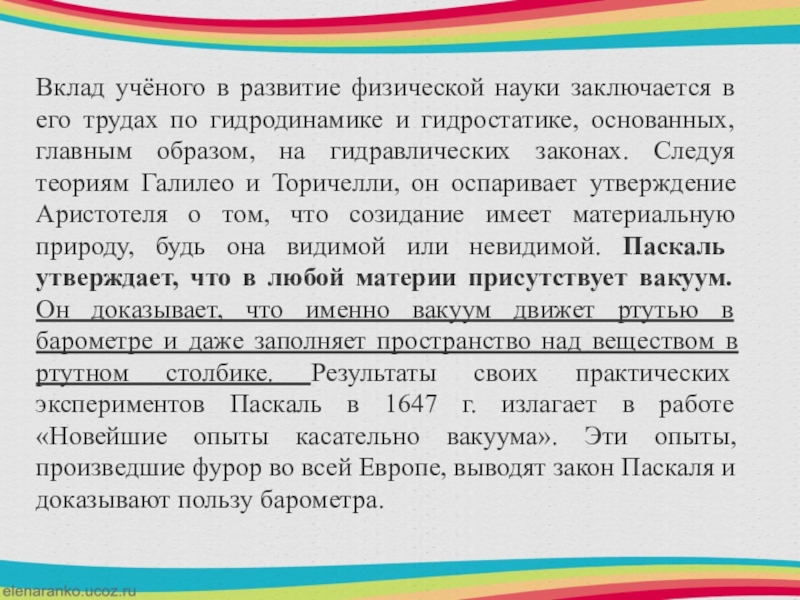 гидродинамике и гидростатике, основанных, главным образом, на гидравлических законах. Следуя теориям Галилео и Торичелли, он оспаривает утверждение Аристотеля о том, что созидание имеет материальную природу, будь она видимой или невидимой. Паскаль утверждает, что в любой материи присутствует вакуум. Он доказывает, что именно вакуум движет ртутью в барометре и даже заполняет пространство над веществом в ртутном столбике. Результаты своих практических экспериментов Паскаль в 1647 г. излагает в работе «Новейшие опыты касательно вакуума». Эти опыты, произведшие фурор во всей Европе, выводят закон Паскаля и доказывают пользу барометра.