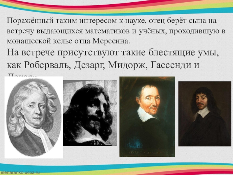 На встрече присутствуют такие блестящие умы, как Роберваль, Дезарг, Мидорж, Гассенди и Декарт.