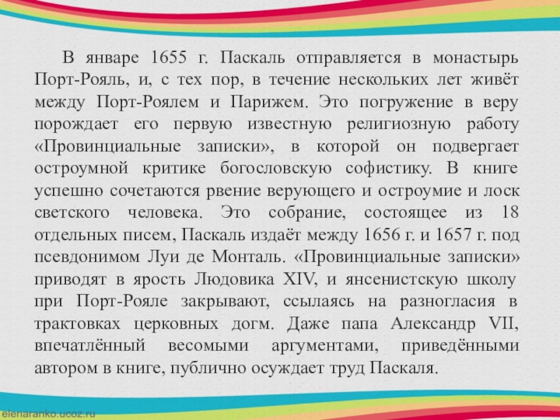 тех пор, в течение нескольких лет живёт между Порт-Роялем и Парижем. Это погружение в веру порождает его первую известную религиозную работу «Провинциальные записки», в которой он подвергает остроумной критике богословскую софистику. В книге успешно сочетаются рвение верующего и остроумие и лоск светского человека. Это собрание, состоящее из 18 отдельных писем, Паскаль издаёт между 1656 г. и 1657 г. под псевдонимом Луи де Монталь. «Провинциальные записки» приводят в ярость Людовика XIV, и янсенистскую школу при Порт-Рояле закрывают, ссылаясь на разногласия в трактовках церковных догм. Даже папа Александр VII, впечатлённый весомыми аргументами, приведёнными автором в книге, публично осуждает труд Паскаля.