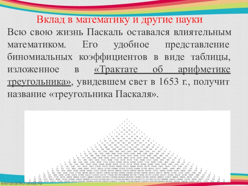 математиком. Его удобное представление биномиальных коэффициентов в виде таблицы, изложенное в «Трактате об арифметике треугольника», увидевшем свет в 1653 г., получит название «треугольника Паскаля».