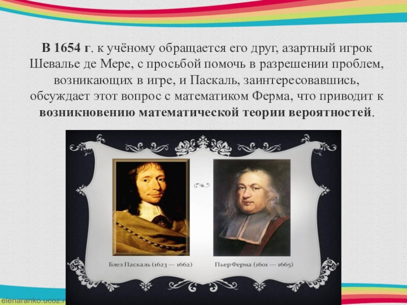 де Мере, с просьбой помочь в разрешении проблем, возникающих в игре, и Паскаль, заинтересовавшись, обсуждает этот вопрос с математиком Ферма, что приводит к возникновению математической теории вероятностей.