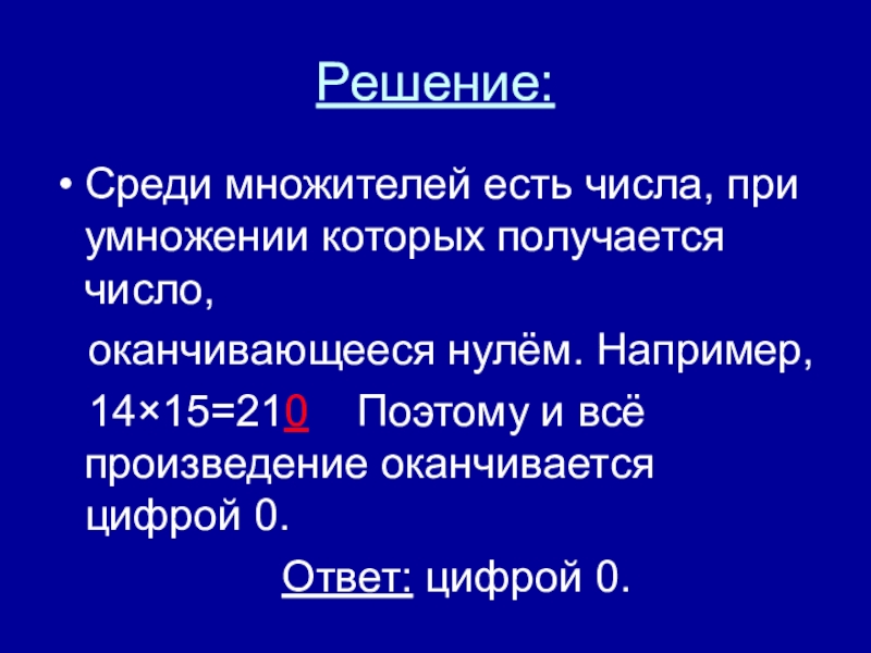14×15=210 Поэтому и всё произведение оканчивается цифрой 0.