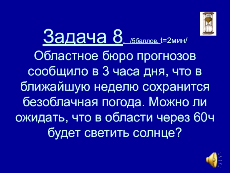 Слайд 48Задача 8. /5баллов, t=2мин/ Областное бюро прогнозов сообщило в 3