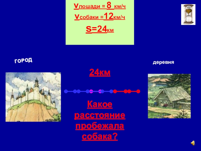 Расстояние от деревни до города было 24км. Из деревни в город выехал колхозник на лошади, скорость которой 8 км/ч.
