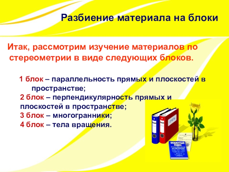 1 блок – параллельность прямых и плоскостей в пространстве;