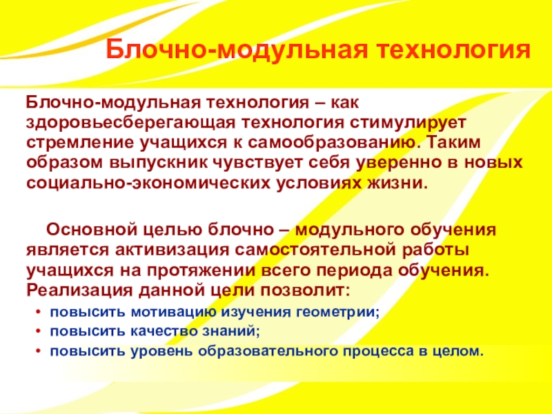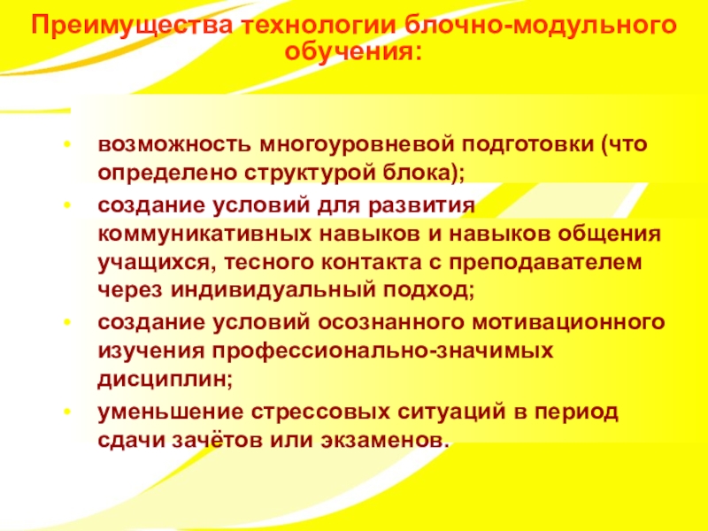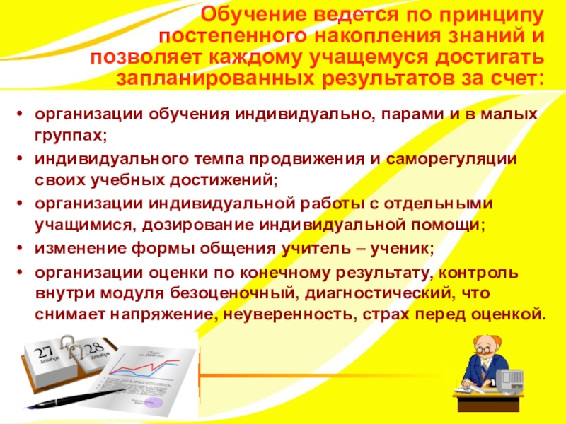 организации оценки по конечному результату, контроль внутри модуля безоценочный, диагностический, что снимает напряжение, неуверенность, страх перед оценкой.