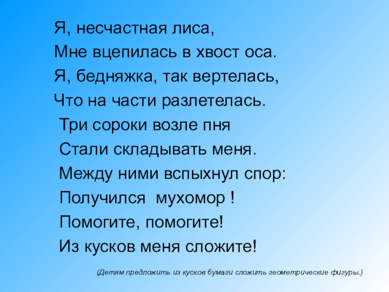 (Детям предложить из кусков бумаги сложить геометрические фигуры.)