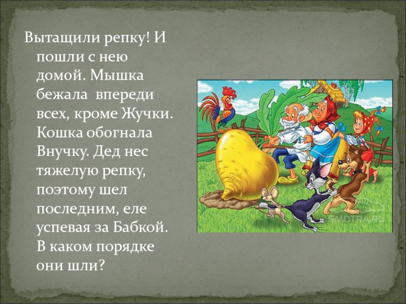 кроме Жучки. Кошка обогнала Внучку. Дед нес тяжелую репку, поэтому шел последним, еле успевая за Бабкой. В каком порядке они шли?
