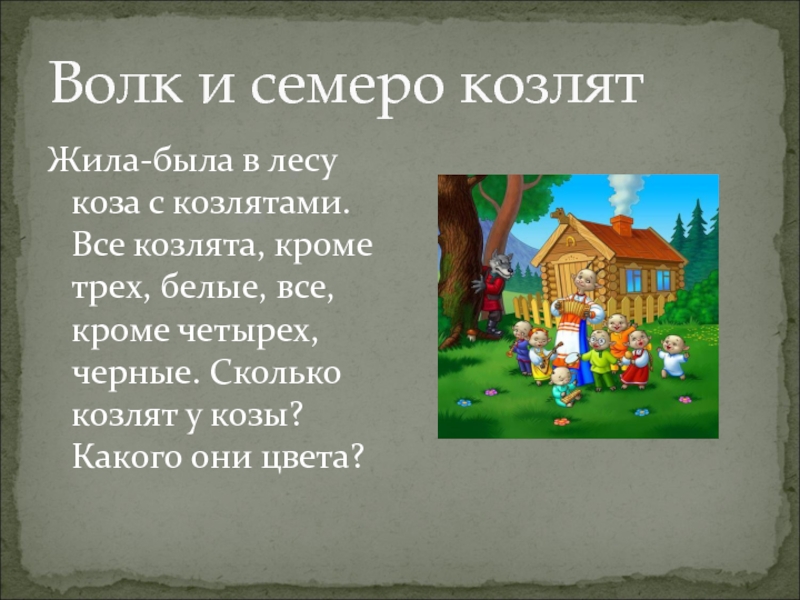 кроме трех, белые, все, кроме четырех, черные. Сколько козлят у козы? Какого они цвета?