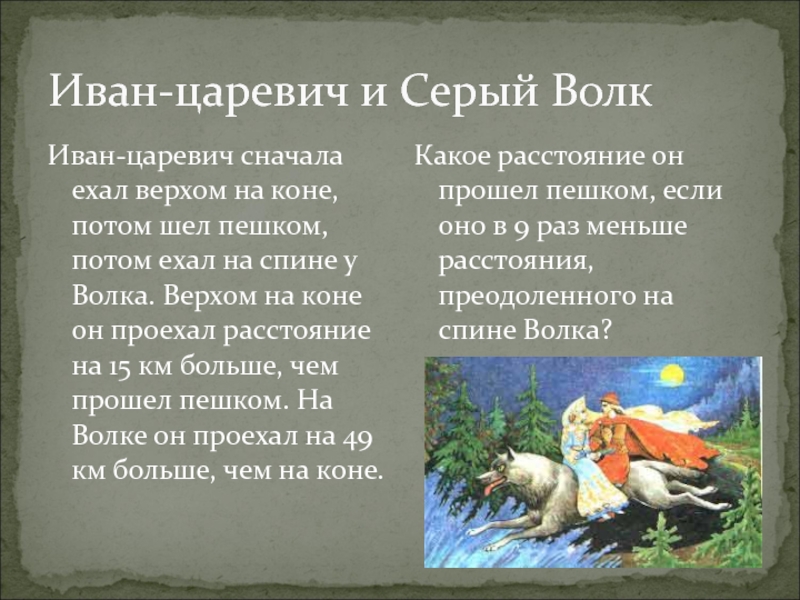 Какое расстояние он прошел пешком, если оно в 9 раз меньше расстояния, преодоленного на спине Волка?