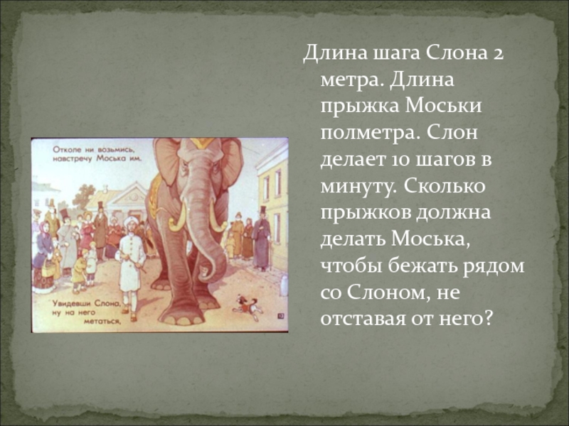 Длина шага Слона 2 метра. Длина прыжка Моськи полметра. Слон делает