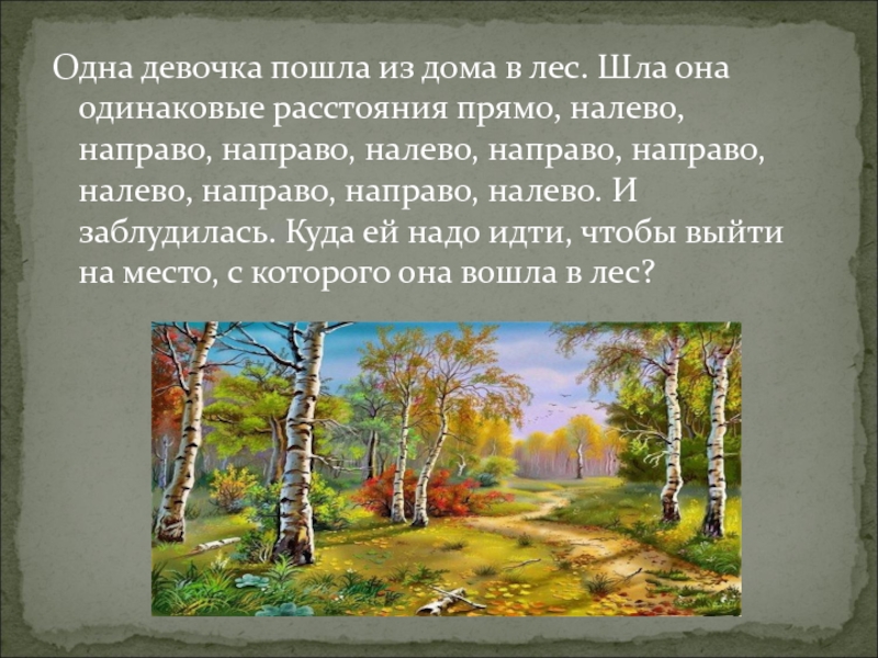 Одна девочка пошла из дома в лес. Шла она одинаковые расстояния