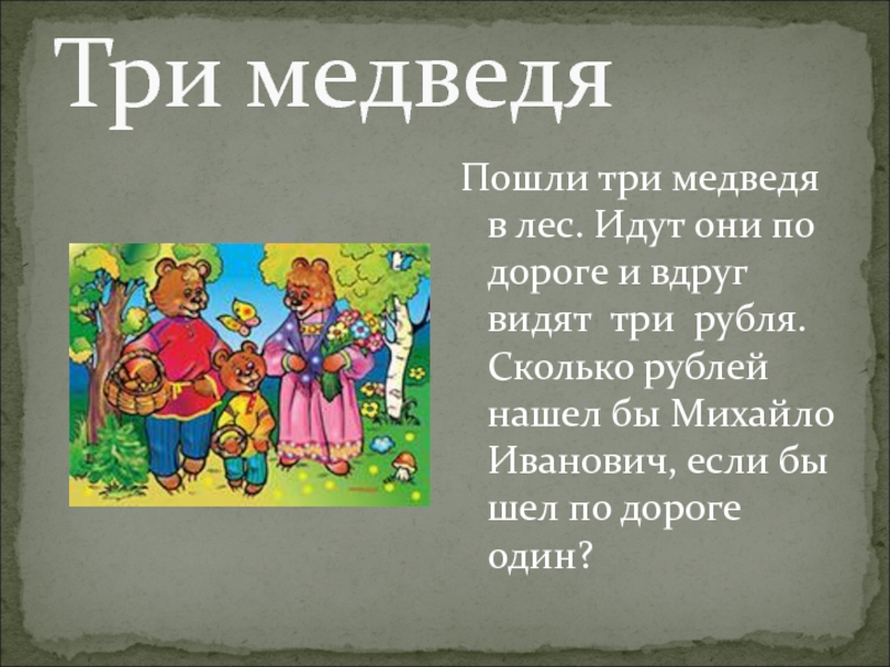 вдруг видят три рубля. Сколько рублей нашел бы Михайло Иванович, если бы шел по дороге один?