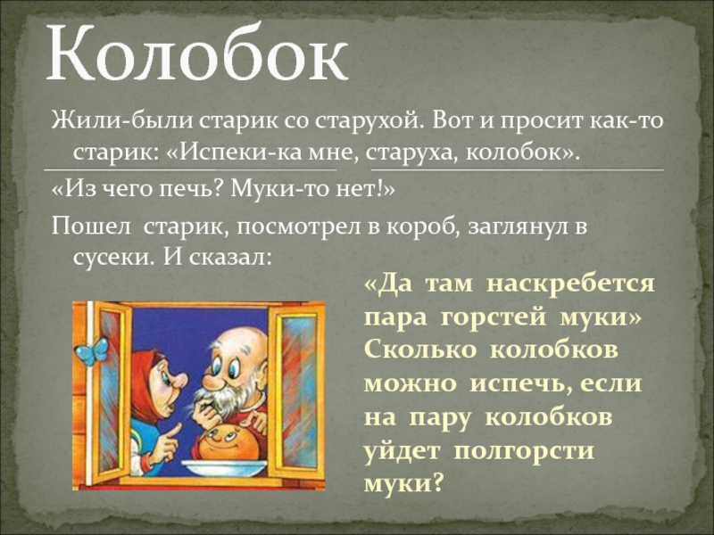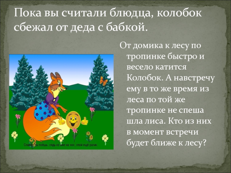Слайд 12Пока вы считали блюдца, колобок сбежал от деда с бабкой.