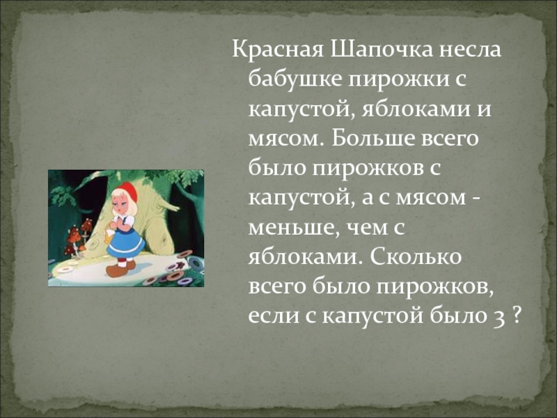 Красная Шапочка несла бабушке пирожки с капустой, яблоками и мясом. Больше