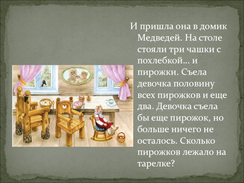 с похлебкой… и пирожки. Съела девочка половину всех пирожков и еще два. Девочка съела бы еще пирожок, но больше ничего не осталось. Сколько пирожков лежало на тарелке?