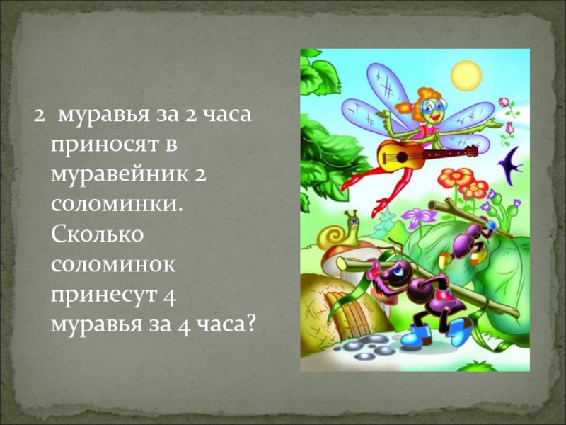 2 муравья за 2 часа приносят в муравейник 2 соломинки. Сколько