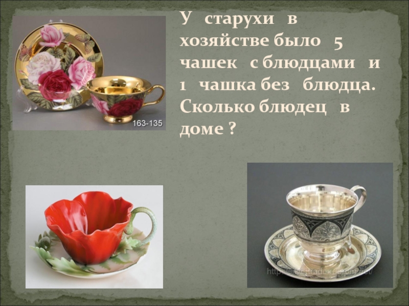 чашек с блюдцами и 1 чашка без блюдца. Сколько блюдец в доме ?