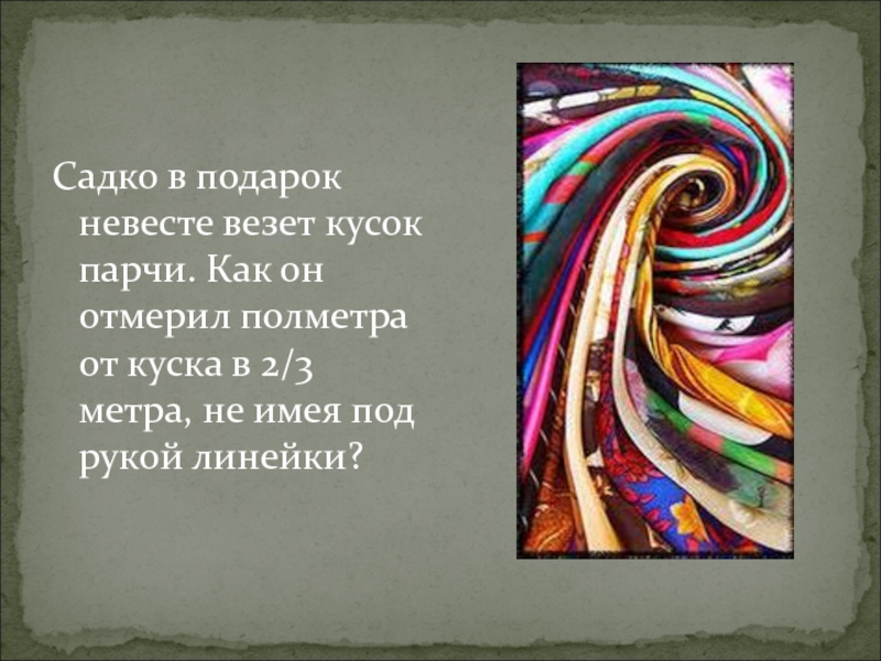Садко в подарок невесте везет кусок парчи. Как он отмерил полметра