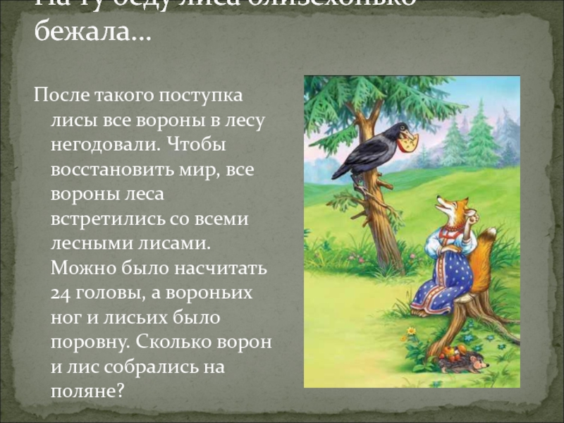 вороны в лесу негодовали. Чтобы восстановить мир, все вороны леса встретились со всеми лесными лисами. Можно было насчитать 24 головы, а вороньих ног и лисьих было поровну. Сколько ворон и лис собрались на поляне?