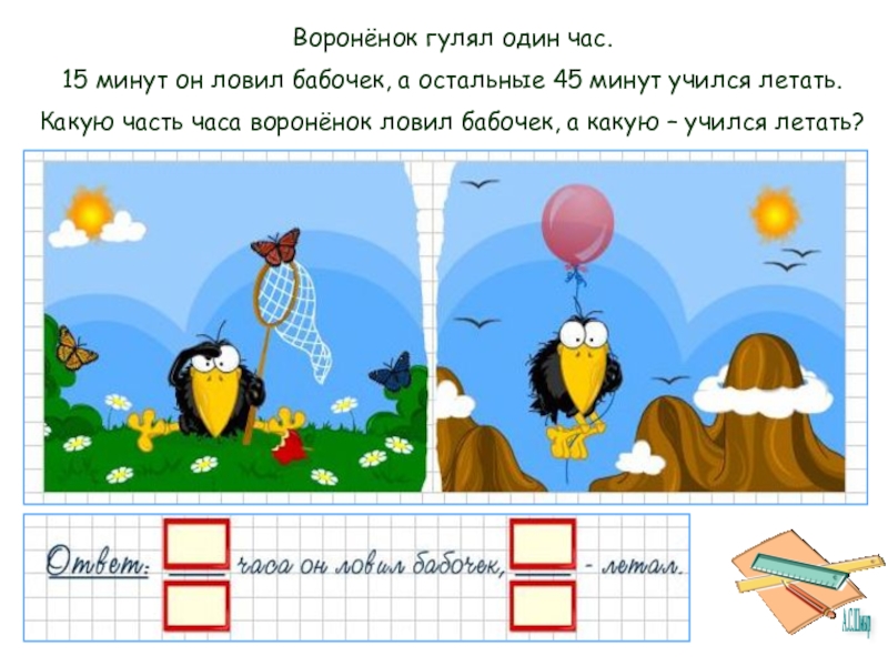 Какую часть часа воронёнок ловил бабочек, а какую – учился летать?