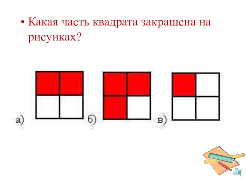 Слайд 2Какая часть квадрата закрашена на рисунках?